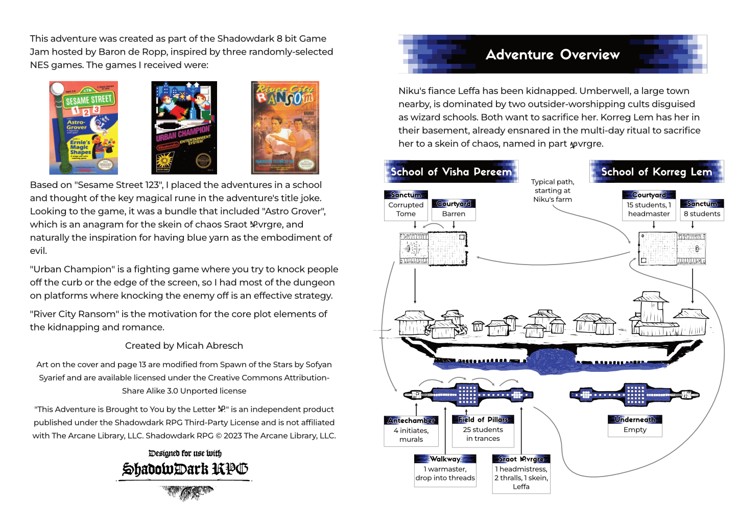 This adventure for Shadowdark was created as a part of the Shadowdark 8 bit Game Jam.